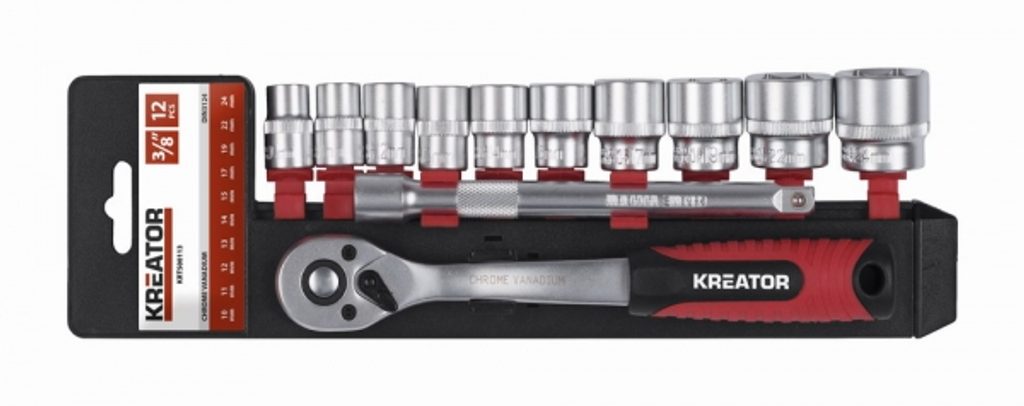 Sada Kreator obsahuje 12 kusů nářadí. V praktickém držáku z odolného plastu najdete nejen ráčnu ve velikosti 3/8", včetně prodlužovacího nástavce o délce 150 mm.