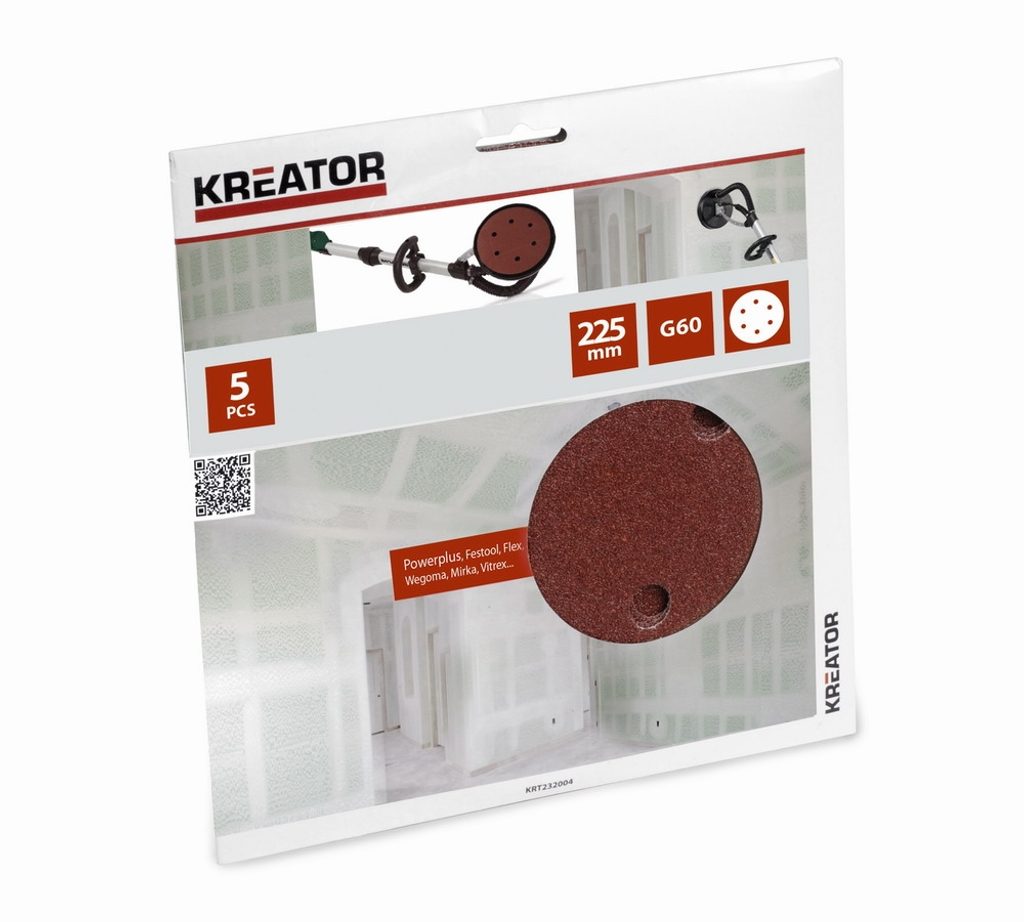 Sada pěti brusných papírů Kreator o průměru 225 mm se zrnitostí G60 KRT232004, je navržena pro použití s excentrickými bruskami. Tyto brusné papíry jsou ideální pro práci se sádrokartonem, kde je potřeba efektivně a rovnoměrně vyhladit povrch.