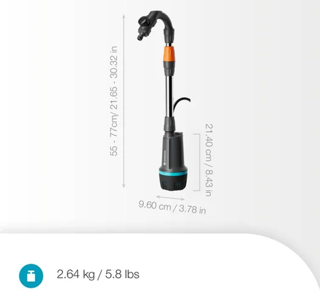 Gardena 2600 Comfort se navíc snadno přizpůsobí různým nádržím na vodu. Hliníková teleskopická trubka s uzavíracím ventilem a prodlužovací trubkou v rozsahu 560–760 mm umožňuje pohodlné nastavení podle výšky sudu či nádrže. Štíhlé bezdrátové provedení se vejde do otvorů od 100 mm a je vhodné také pro IBC nádrže a další systémy pro skladování dešťové vody.