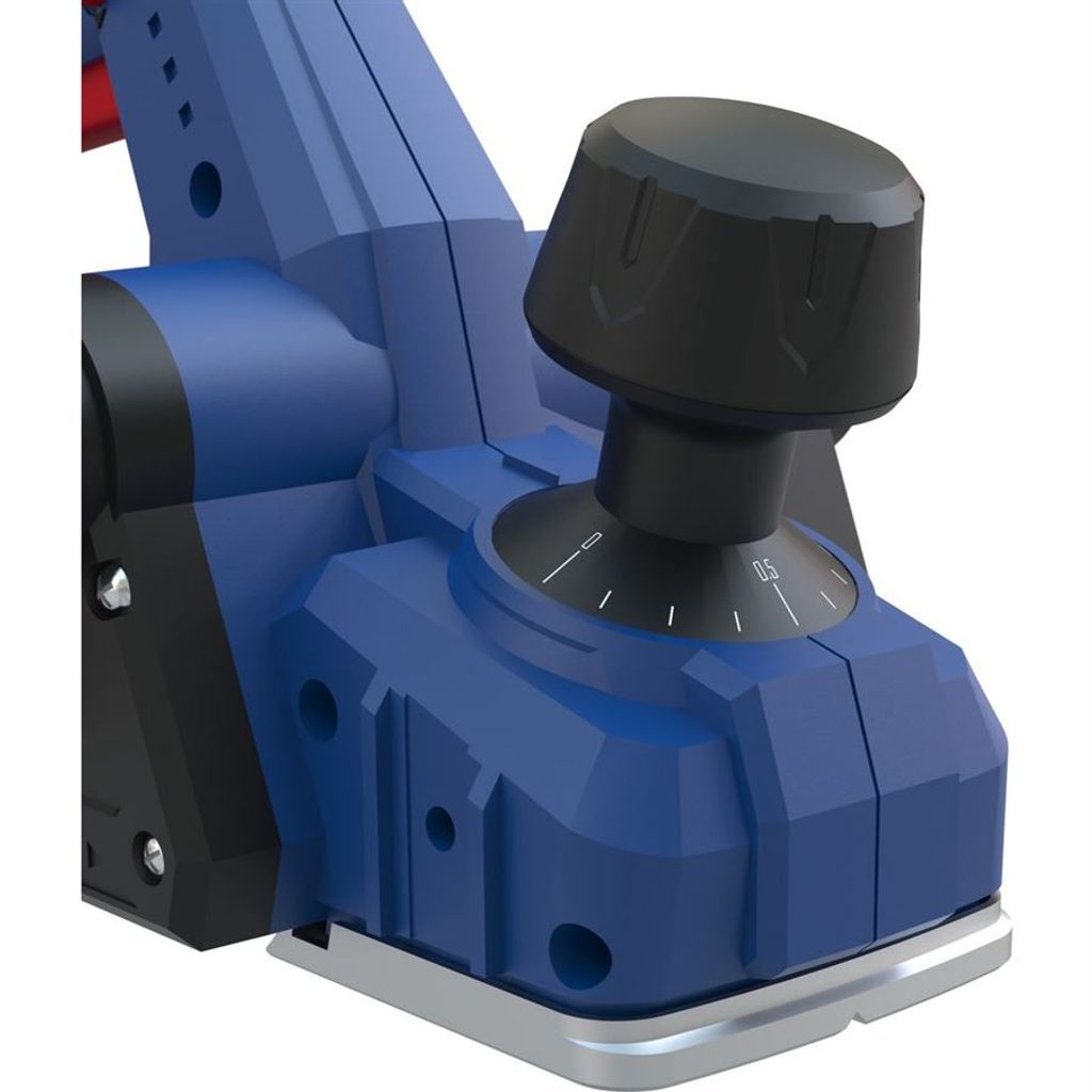 Masivní hliníková základová deska zajišťuje perfektní stabilitu a přesnost hoblování. Hoblík je vybaven dvěma karbidovými oboustrannými noži, které garantují dlouhou životnost a čistý řez. Pro pohodlné a precizní srážení hran nechybí ani V-drážka různých velikostí. Ochranu obrobku při odložení zajišťuje automaticky odklápěcí parkovací botka, která zabrání nechtěnému poškození materiálu.