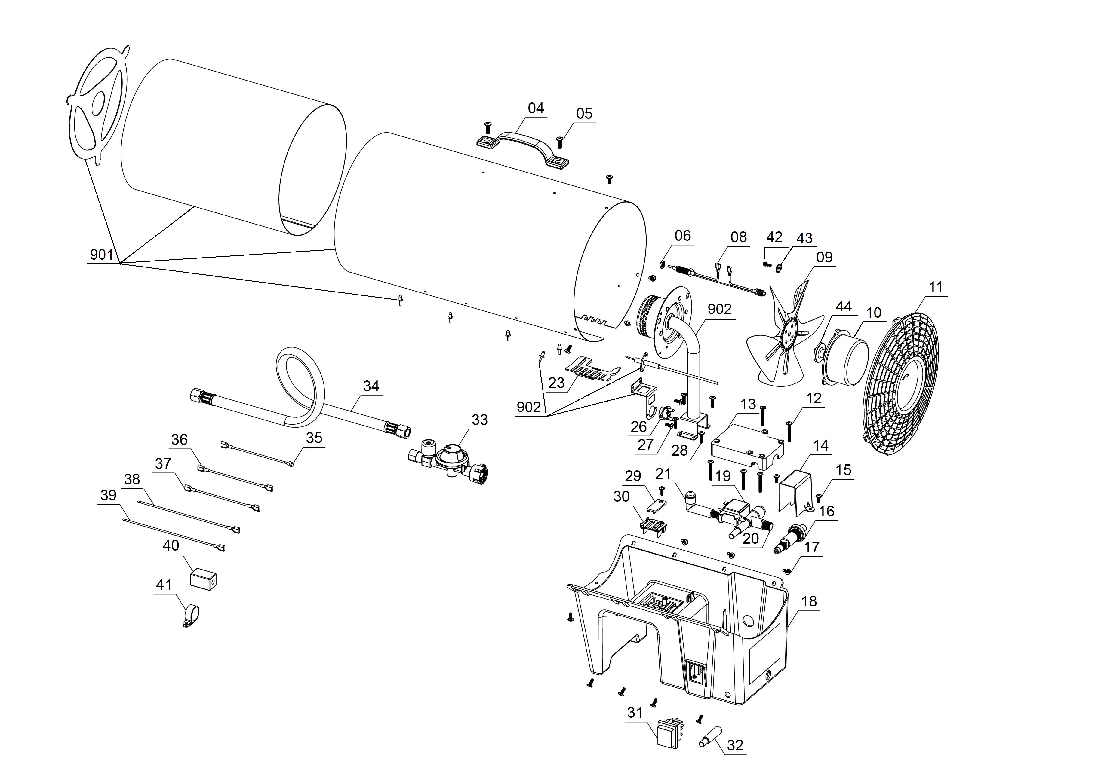 Spínač zapnutí/vypnutí ventilátoru, tlačítko plynového ventilu a elektromagnetický ventil umožňují jednoduché a intuitivní ovládání. Regulátor tlaku udržuje pracovní tlak na bezpečných 1,5 bar, což zajišťuje stabilní výkon.