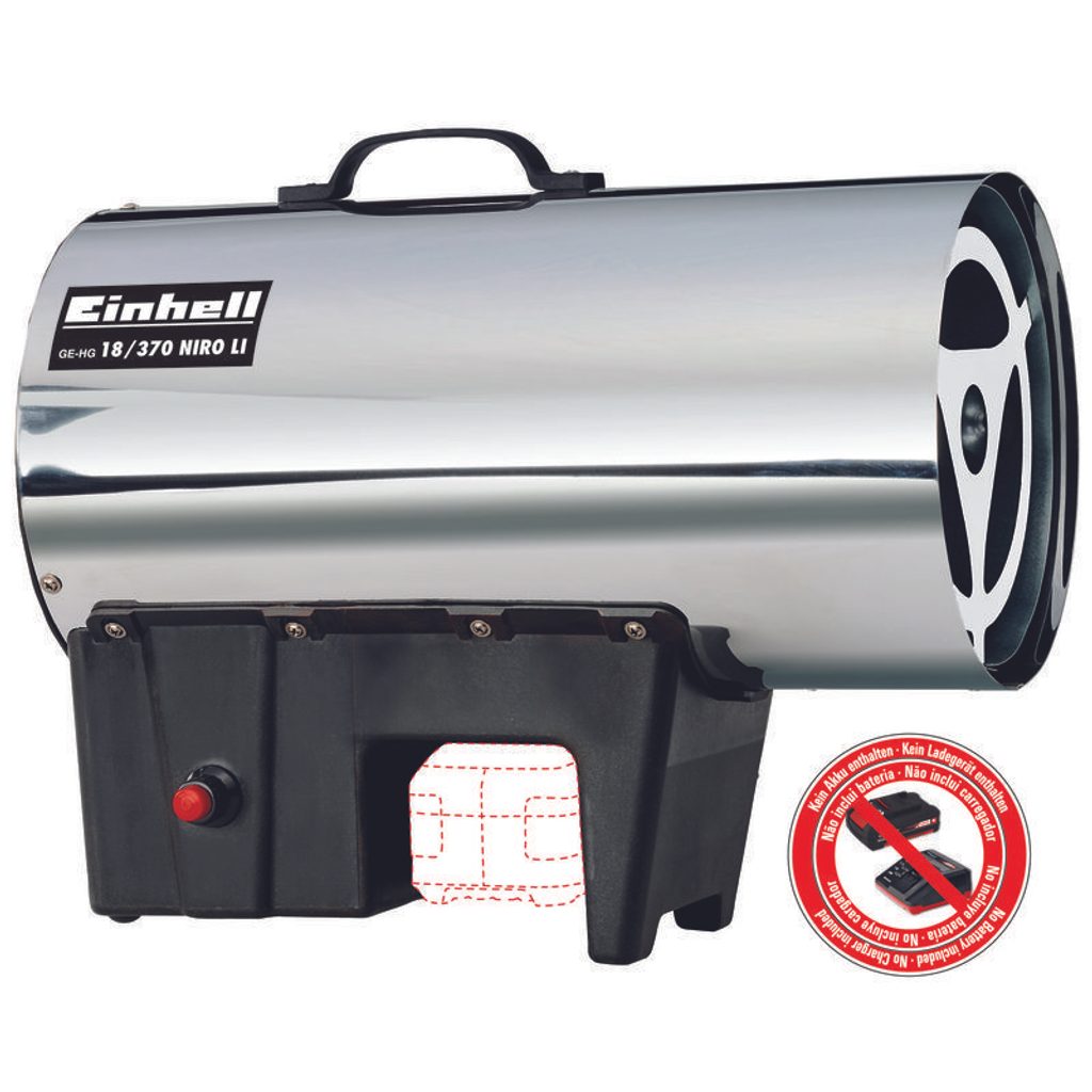 Aku horkovzdušná turbína Einhell GE-HG 18/370 přeměňuje propanový plyn na úctyhodný topný výkon až 37 kW, což z ní činí skvělého pomocníka pro práci v dílnách, garážích nebo na stavbě.