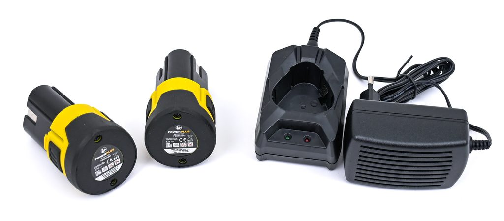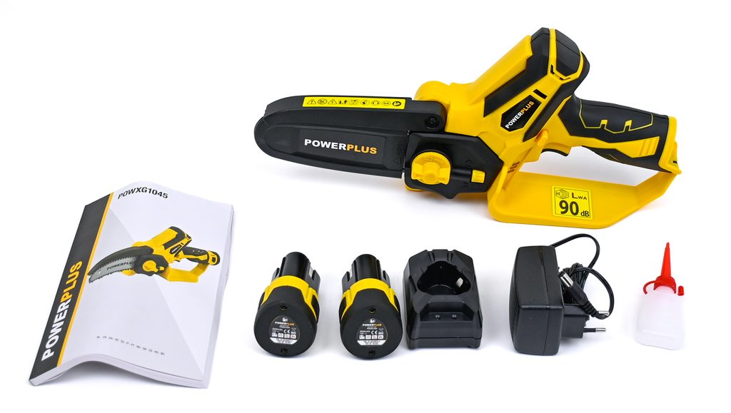 Součástí balení je i extra 12V baterie s nabíječkou, což umožňuje nabíjení rezervní baterie během práce a plynulý průběh práce. K pila je přibalena ochrana pro řetěz a lištu a prázdná 20ml lahvička pro olej.