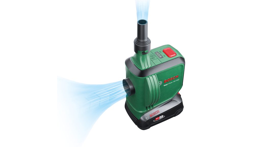 Bosch EasyInflate 18V-500 se může pochlubit maximálním průtokem vzduchu 530 litrů za minutu, což zaručuje efektivní použití i při náročnějších úkolech. S 50cm hadicí a jednoduchým spínačem je ovládání intuitivní a pohodlné. Součástí balení jsou tři nástavce na ventily různých velikostí, takže je připraven na jakékoli výzvy, ať už u bazénu, jezera nebo na kempování.