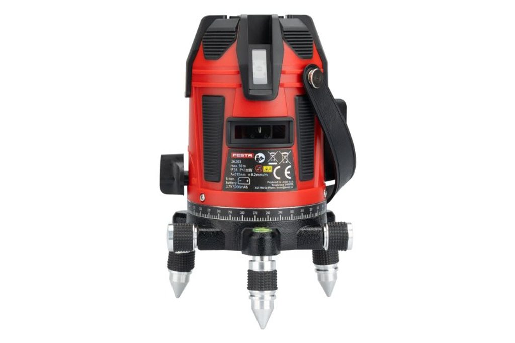 Aku křížový laserový měřič FESTA 4V/1H 26203 je profesionální přístroj se zeleným laserovým paprskem, který vyniká vysokou přesností a spolehlivostí. Nabízí jednu horizontální a čtyři vertikální roviny pro maximální flexibilitu při měření. Samozřejmostí je také funkce olovnice, na podlahu promítne červený bod (při použití na stativu je nutné zvolit variantu s dutým závitem).