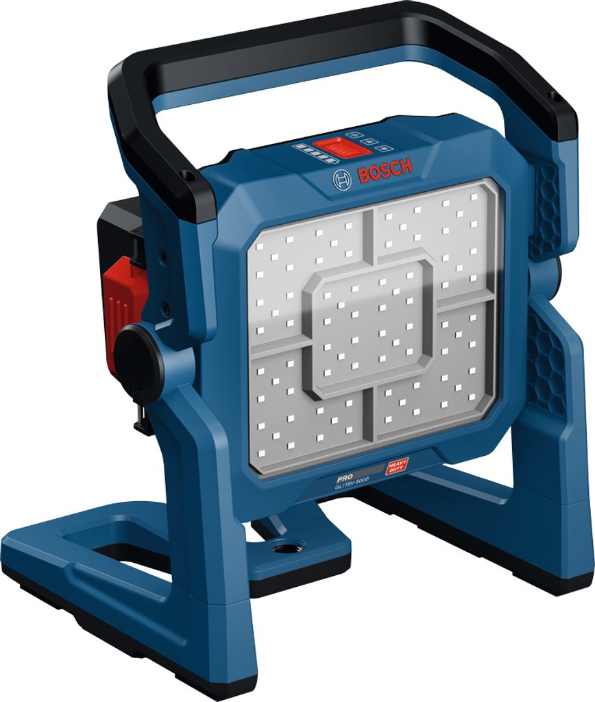 Aku LED svítilna Bosch PRO GLI18V-5000 je výkonný pracovní světlomet pro osvětlení středních až velkých pracovních ploch. Díky 80 LED diodám a třem úrovním jasu poskytuje světelný tok až 5 000 lm, takže se hodí na stavbu, do dílny i pro servisní práce v horších světelných podmínkách. Ovládání je řešeno jednoduše jedním tlačítkem a uživatelské rozhraní přehledně zobrazuje nastavený jas i stav akumulátoru.