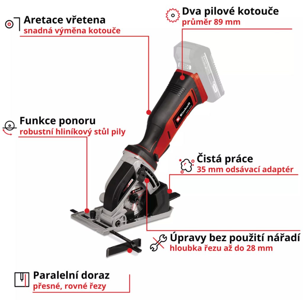 Na aku mini ruční pile lze snadno a bez nářadí nastavit hloubku řezu a výměna pilového kotouče je extrémně snadná díky aretaci vřetena. Vysoce kvalitní karbidový pilový kotouč a posuvný doraz zajišťují čisté a přesné řezy, max. hloubka řezu je 28 mm díky pilovému kotouči o průměru 89 mm. Vysoce kvalitní pilový stůl vyrobený ze slitiny hliníku zaručuje optimální stabilitu. Adaptér na odsavač prachu pro udržení čistého pracoviště.