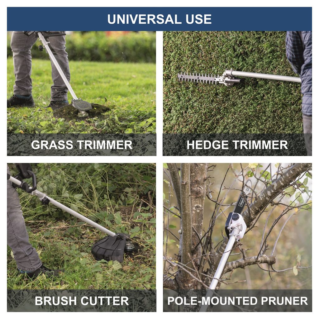Zařízení umožňuje snadnou výměnu nástavců bez použití nářadí a nastavení rychlosti nástrojů pomocí ovládacího panelu, který je pohodlně umístěn blízko rukojeti. Pro větší pohodlí je vybaveno ergonomickým popruhem přes rameno s rychloupínacím mechanismem, který snižuje únavu i při delším používání. Stroj je dodáván bez baterie a nabíječky.