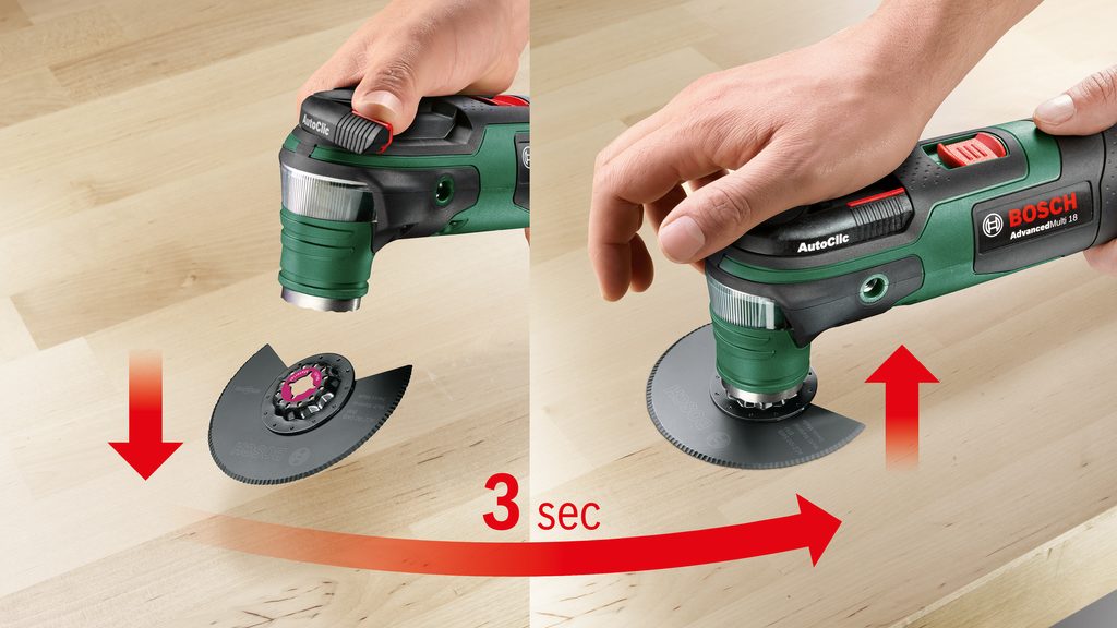 Pracovní prostor je optimálně nasvícen díky 180° světelnému pásu, takže máte vždy dokonalý přehled o dění na obrobku. Systém Bosch AutoClic umožňuje rychlou výměnu příslušenství bez použití klíče – zvládnete ji během pouhých 3 sekund.
