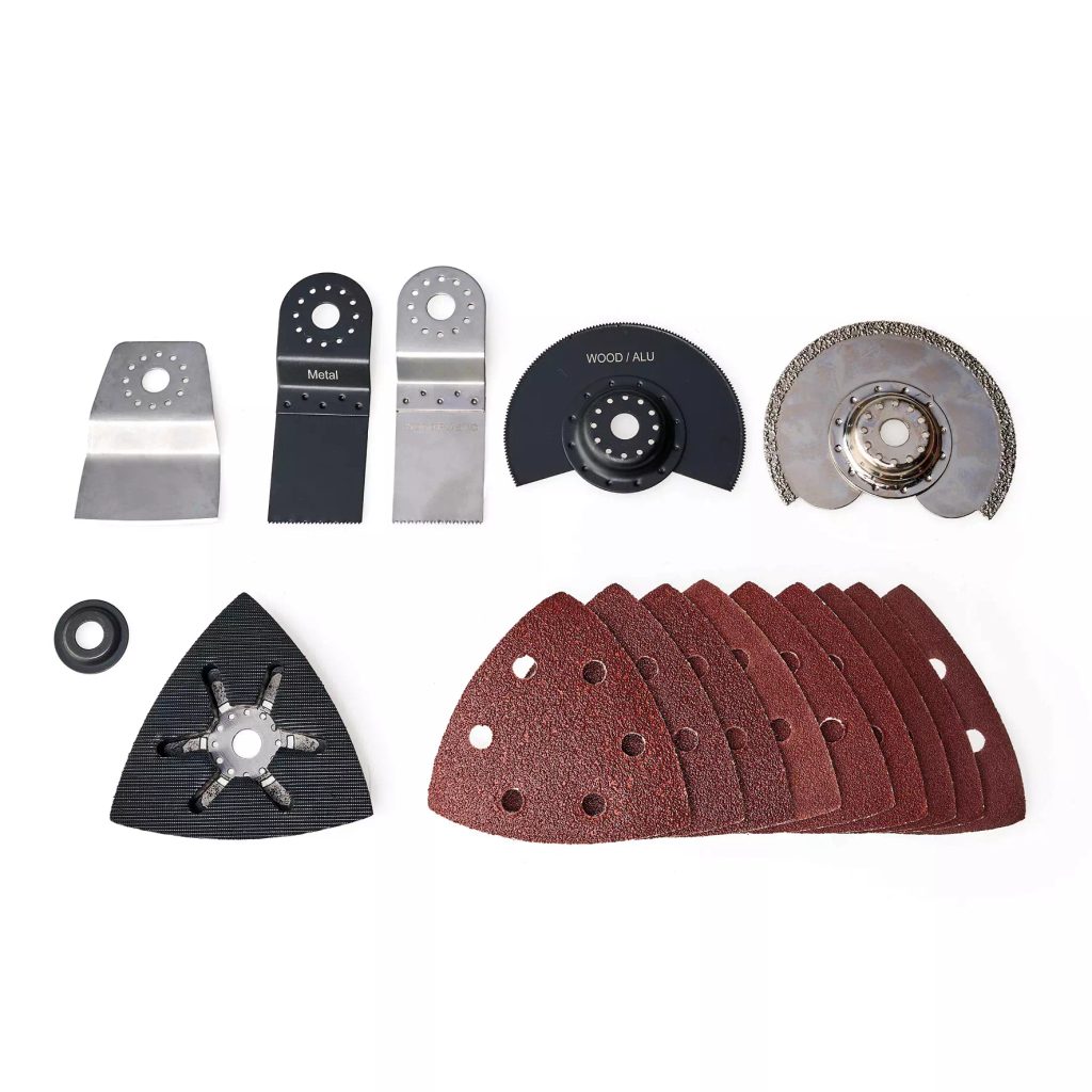 V bohaté výbavě najdete delta brusnou desku se suchým zipem, 9 brusných papírů (P60, P80, P120), škrabku, ponorné pilové kotouče na dřevo, plast i kov, segmentové pilové kotouče a diamantový segmentový kotouč na spáry dlaždic. Varianta Li BL-Solo je dodávána bez baterie a nabíječky.