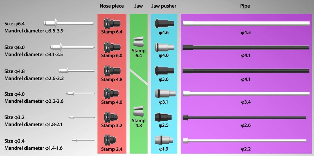 Tenké provedení ústí stroje umožňuje práci ve stísněných prostorech, což ocení uživatelé při montážích v těžko přístupných místech. Spolehlivé uchycení nýtu v kleštině zajišťuje, že není třeba nýt přidržovat ani při práci kolmo k zemi. Pro pohodlné a organizované používání je nýtovačka vybavena plastovým zásobníkem na použité dříky.