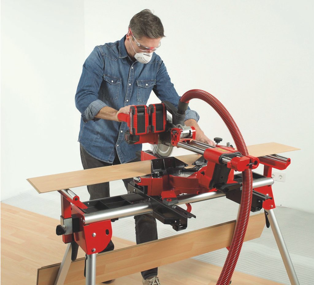 Otočný stůl má možnost přesného nastavení úhlu pro úhlové řezy. Kromě toho lze pilový kotouč pro pokosové řezy naklonit až o 45 ° doleva.