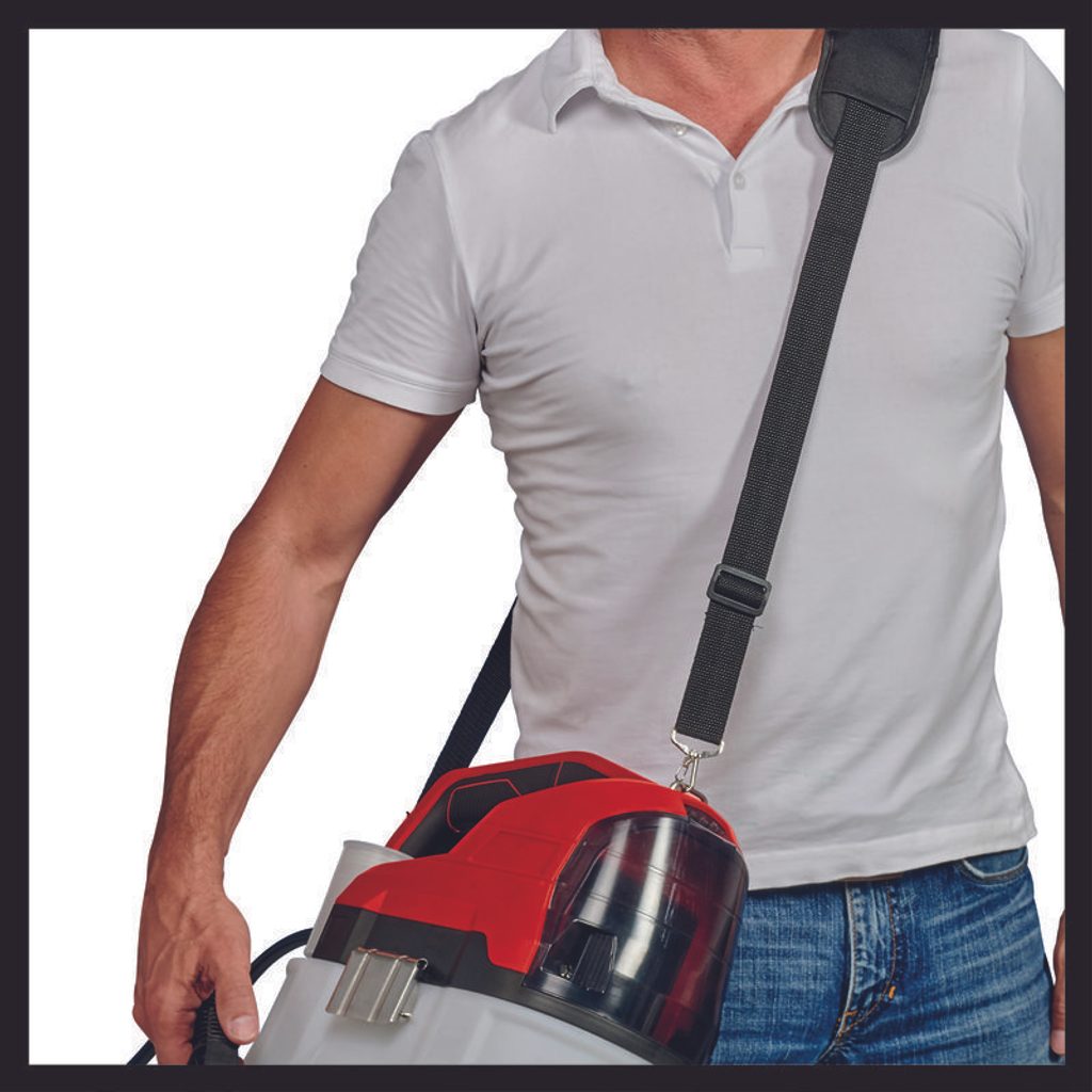 Polstrovaný ramenní popruh zajišťuje pohodlné nošení a práci bez únavy. Kryt baterie poskytuje ochranu před stříkající vodou. Baterie a nabíječka jsou k dispozici samostatně, například jako praktická startovací sada - starter-kit.