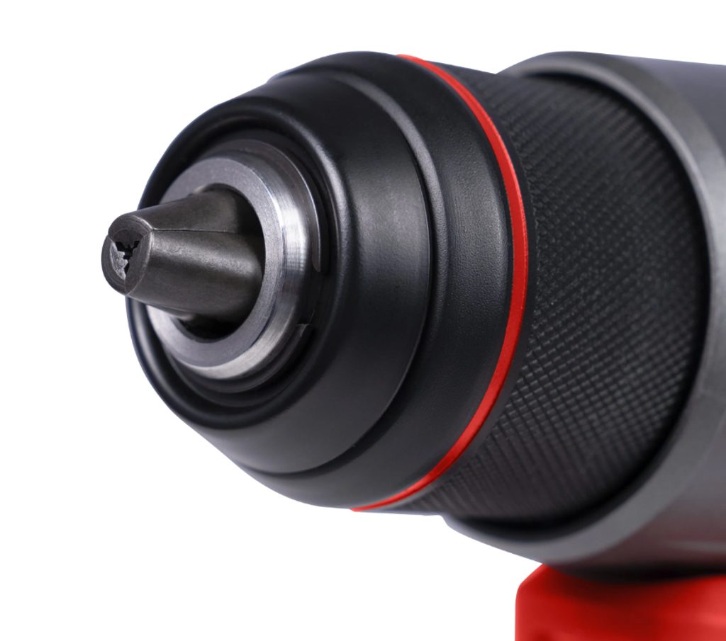 Pro pohodlnou práci je vrtačka vybavena 13 mm kovovým sklíčidlem, které umožňuje rychlou výměnu a spolehlivé upevnění bitů. Uživatelský komfort zvyšuje mechanická spojka s 13 nastavitelnými polohami, doplněná o dvě speciální polohy - jednu pro zablokování spojky při vrtání a druhou pro příklepové vrtání.
