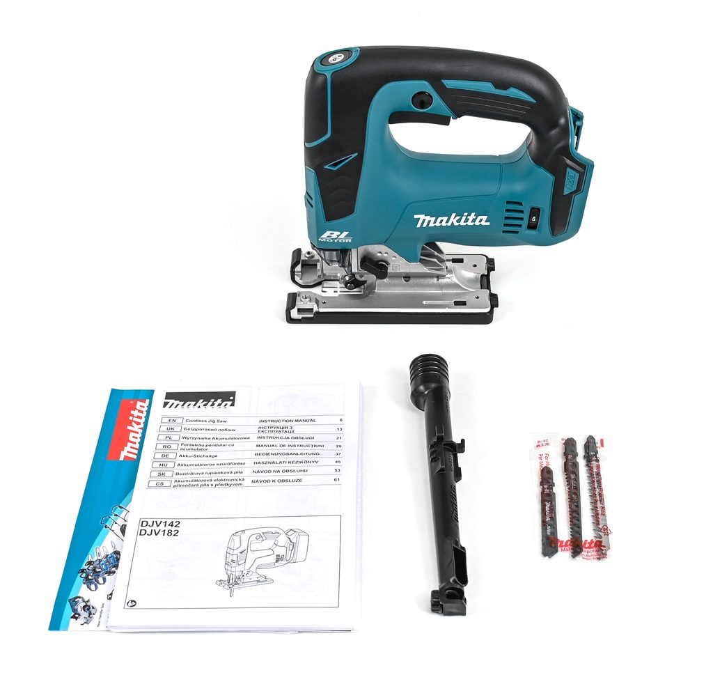 Ofukování linie řezu a možnost připojení vysavače zajišťují čistý a přehledný pracovní prostor. Pro náročnější a přesné řezy snadno připojíte také vodící lištu díky adaptéru 193517-1. Aku přímočará pila Makita je součástí aku programu Makita LXT 18V a je tak kompatibilní s akumulátory této řady.