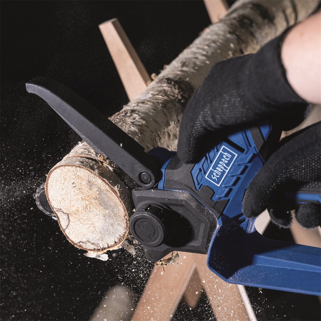 Napnutí řetězu lze jednoduše upravit podle potřeby a praktický úložný prostor pro olejovou lahvičku přímo na přístroji usnadňuje údržbu lišty i řetězu a zvyšuje pohodlí při práci. Pila je vybavena moderním uhlíkovým motorem zajišťující plynulý chod. Stroj je plně kompatibilní se všemi akumulátory a nabíječkami řady Scheppach IXES 20V, které nabízí maximální flexibilitu a pohodlí bez kabelů.