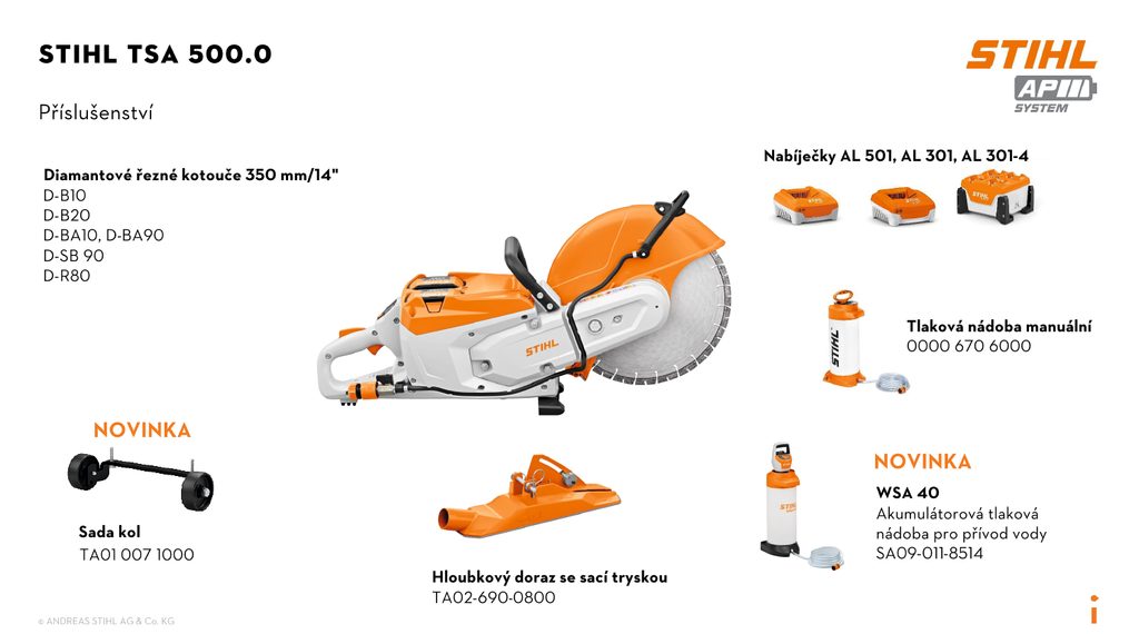 Aku rozbrušovací pila STIHL TSA 500 B přináší špičkový výkon a maximální flexibilitu pro profesionální použití. Je ideální volbou pro profesionály v zahradnictví, krajinářství, stavebnictví, záchranných složkách i hasičských sborech. Tento akumulátorový rozbrušovací stroj je napájen dvojicí akumulátorů ze systému STIHL AP, které zajišťují dlouhou provozní dobu a stabilní výkon i při náročné práci.