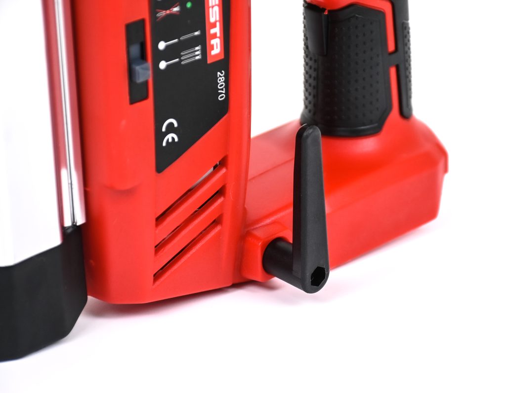 Bezpečnostní pojistka spínače zabraňuje náhodnému "výstřelu" spony nebo hřebíku. Ergonomicky tvarované úchopvé části pro pohodlné držení a manipulaci při práci. Umístění ovládacích prvků uzpůsobené pro pravou i levou ruku. Snadná výměna nebo doplnění spon/hřebíků v zásobníku.