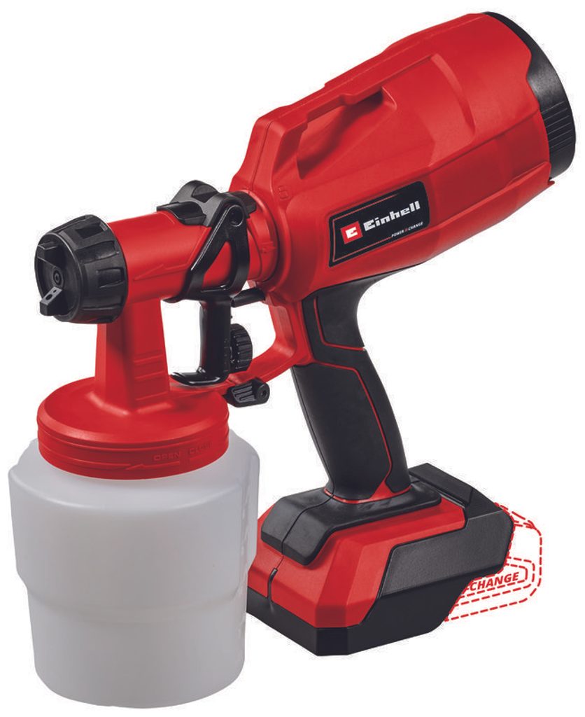 Jako součást rodiny Power X-Change je stříkací pistole kompatibilní s bateriemi z aku programu Einhell. Výkonný motor dokáže dodávat barvu rychlostí až 650 ml za minutu. Nastavitelný vzduchový uzávěr umožňuje přizpůsobit proud barvy pro vertikální, horizontální nebo všesměrové trysky podle potřeby.