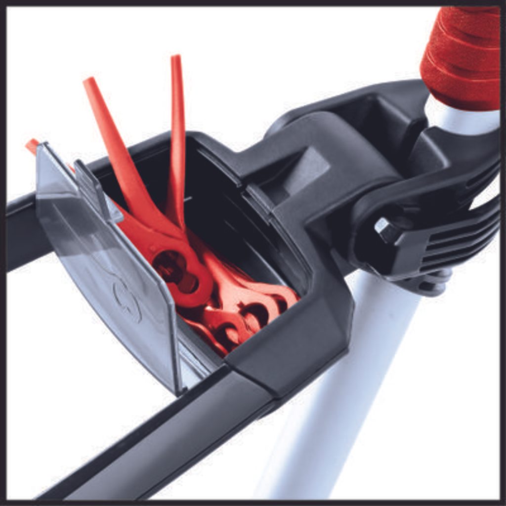Díky měkkému úchopu, plynule nastavitelné druhé rukojeti s integrovanou přihrádkou pro 20 nožů (součást dodávky) a hlavě motoru, kterou lze otáčet v rozsahu +/- 90° a naklápět do 5 poloh, lze snadno a pohodlně zvládnout i obtížné situace, jako jsou svislé plochy a okraje trávníku.