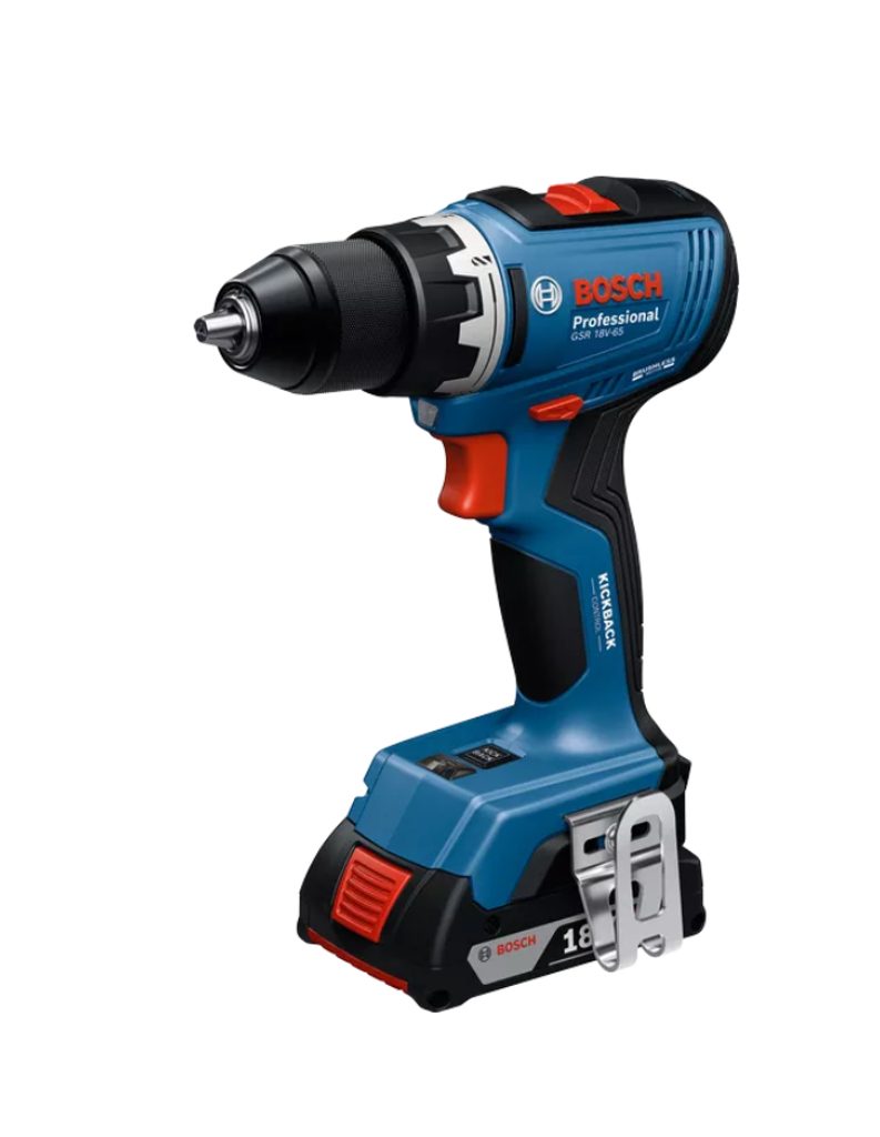 Aku vrtací šroubovák Bosch GSR 18V-65 06019N3206 je vhodný pro náročné vrtací práce, které snadno zvládá díky vylepšenému krouticímu momentu 63 Nm. Díky kompaktní konstrukci s délkou hlavy pouhých 166 mm je praktický i v těsných prostorech, kde je potřeba precizní manipulace.