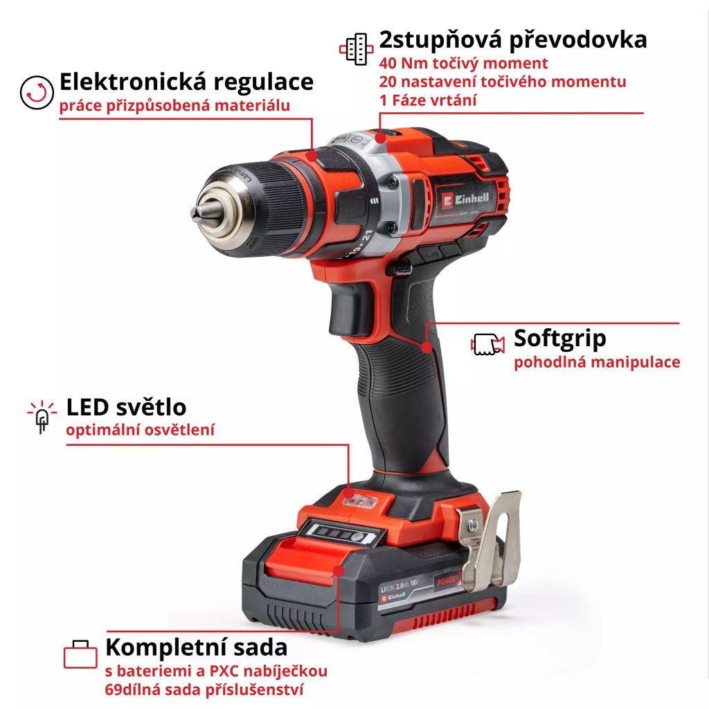 Aku vrtačka Einhell TE-CD 18/40 Li (2x2,0 Ah) + 69 ks příslušenství 4513934