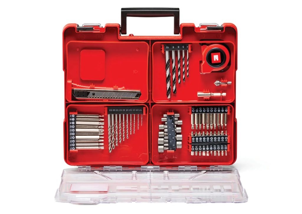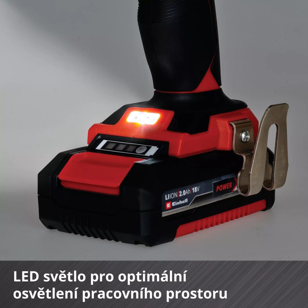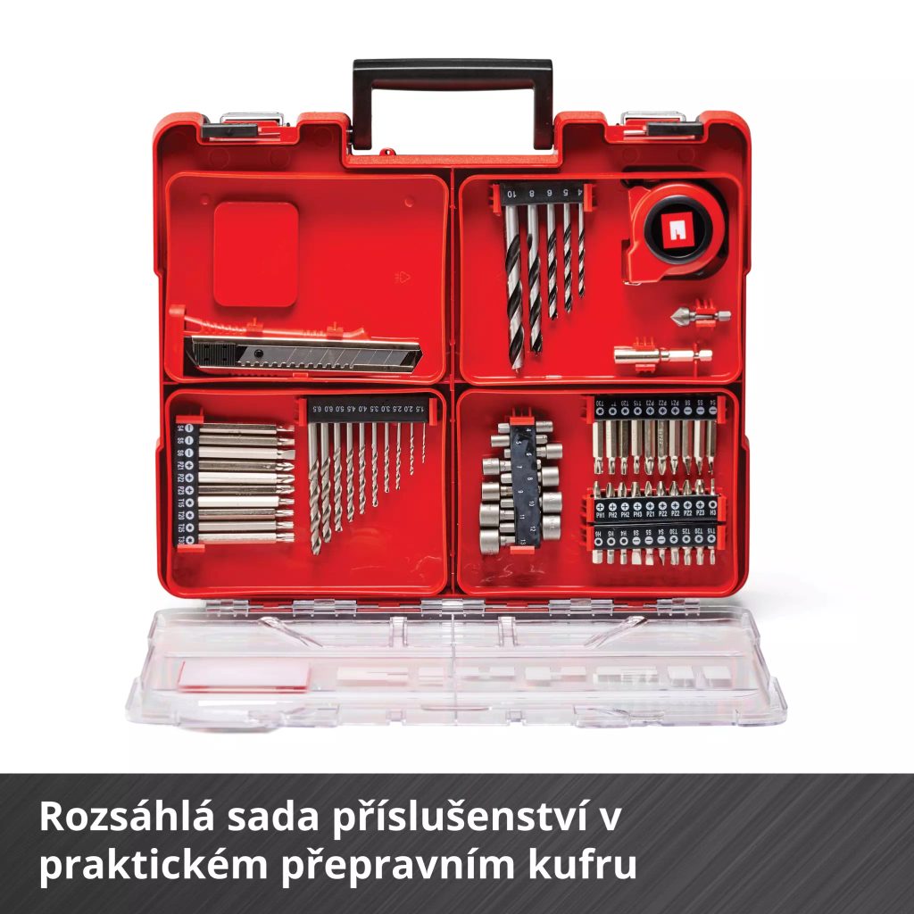 Součástí balení jsou dvě 2,0Ah baterie systému Power X-Change a rychlonabíječka – stejné akumulátory můžete používat i v dalším nářadí a zahradní technice Einhell z rodiny Power X-Change, přičemž Li-Ion technologie bez samovybíjení zaručuje, že jsou baterie kdykoli připraveny k použití. Celý set je dodáván v odolném kufříku s 69 dílným příslušenstvím.