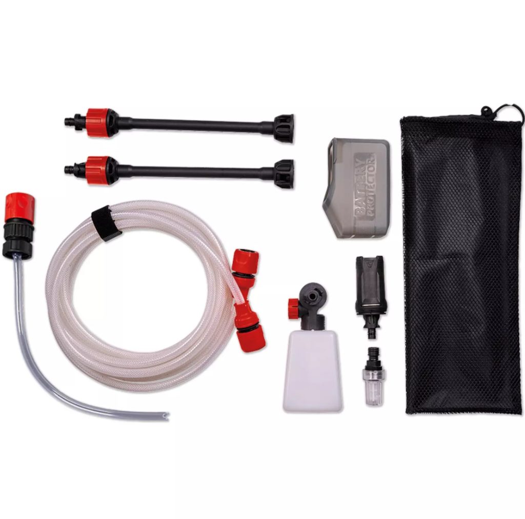 Vysokotlaká pistole může být připojena přímo k zahradní hadici, ale díky vodnímu filtru a 5metrové sací hadici dokáže čerpat vodu také z kbelíků, kanystrů nebo rybníků. Součástí balení je adaptér na PET lahve, který umožňuje použití vody ze standardních lahví při cestování. Dále v sadě najdete dva prodlužovací nástavce, pěnovou rozprašovací láhev ideální pro mytí auta, síťovanou tašku pro uložení příslušenství a kryt proti stříkající vodě.