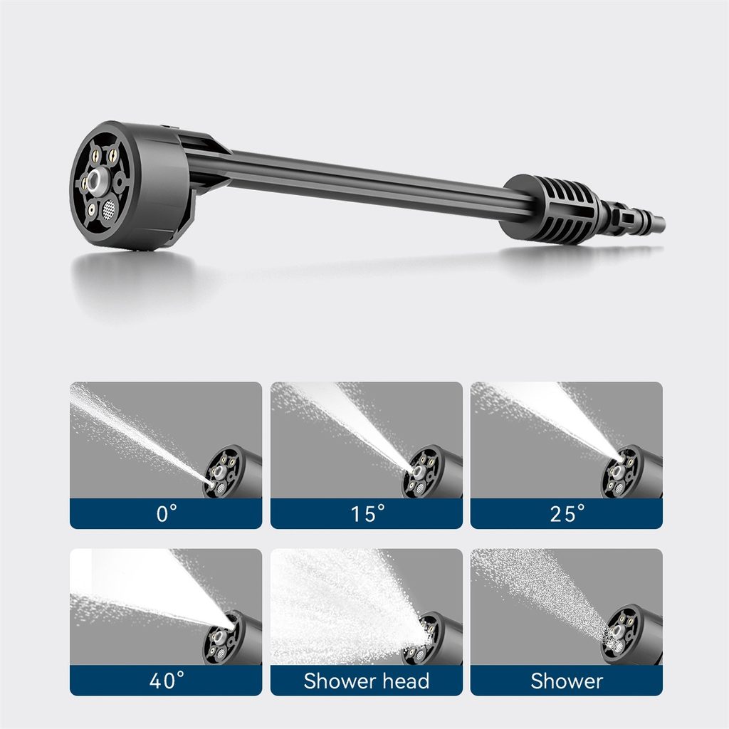 Na přehledném displeji si jednoduše zvolíte jednu ze tří úrovní tlaku ostřiku a zároveň máte neustále pod kontrolou stav nabití baterie. Praktická šestipolohová multifunkční tryska nabízí čtyři úhly vysokotlakého paprsku (0°, 15°, 25° a 40°) a dvě polohy pro oplach či zalévání s nízkým tlakem a širokým rozptylem.