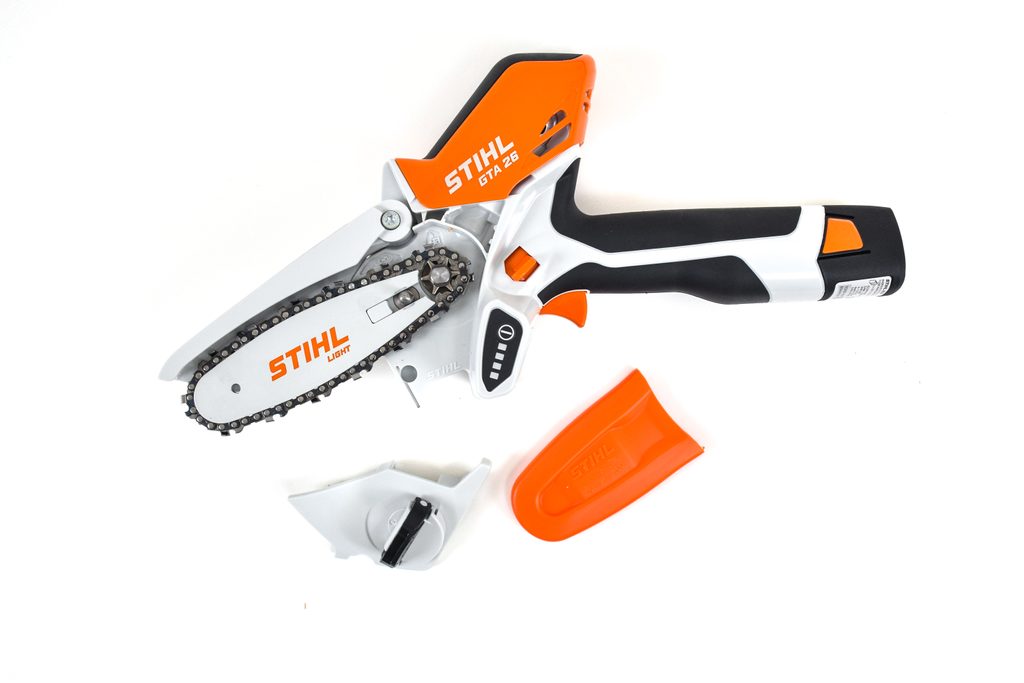 Ve výbavě nechybí ergonomická protiskluzová rukojeť a ochranný kryt řetězu pro bezpečnou práci. Řetěz lze vyměnit naprosto jednoduše a bez použití nářadí. Aku minipila STIHL GTA 26 pracuje s akumulátory ze systému STIHL AS.