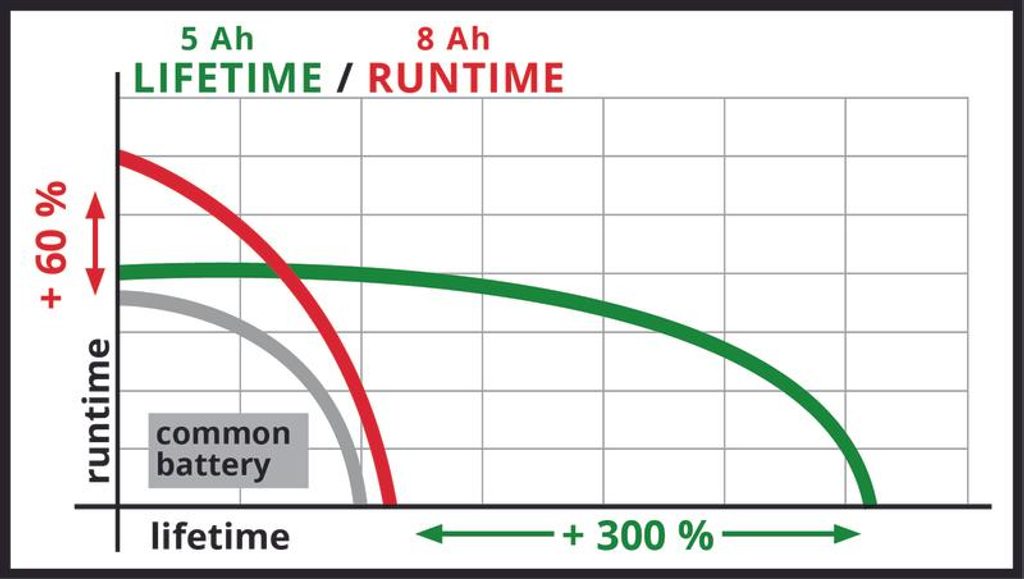 Výhody tohoto akumulátoru jsou mnohonásobné. Nabízí technologii MULTI-Ah, která umožňuje výběr mezi kapacitou 8 Ah pro delší dobu provozu a 5 Ah pro lehčí aplikace s delší výdrží. Použití lithium-iontových článků nejnovější generace zajišťuje dvojnásobnou energii a maximální výkon.