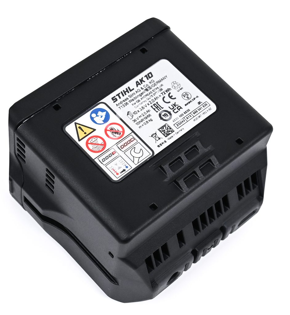 Lithium-iontový akumulátor s kapacitou 72 Wh je plně kompatibilní s přístroji STIHL ze systému AK. Doba provozu akumulátoru se může lišit v závislosti na konkrétním způsobu využití zařízení. Pro snadnou kontrolu stavu nabití je vybaven čtyřmi LED indikátory.