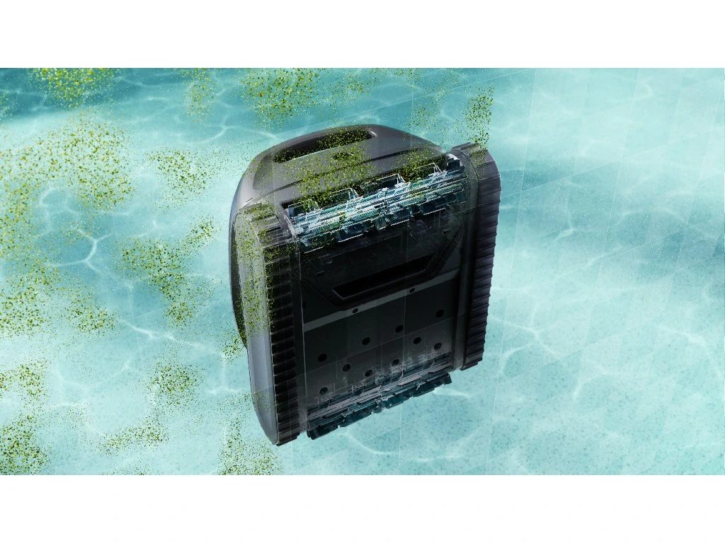 Dvojité válcové kartáče vytvářejí širokou čisticí stopu 260 mm a účinně uvolňují nečistoty od jemného písku až po listí a řasy. Silné sání s průtokem 25,7 m³ za hodinu dopraví nečistoty do velkého filtračního koše o objemu 5 litrů. Filtrace 150 μm je vhodná pro běžné znečištění, a pro jemnější filtraci lze použít volitelný filtr 3 μm jako příslušenství.