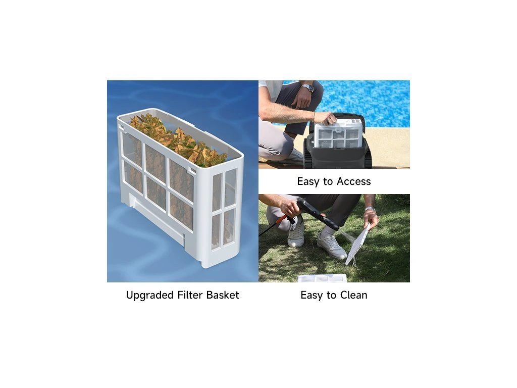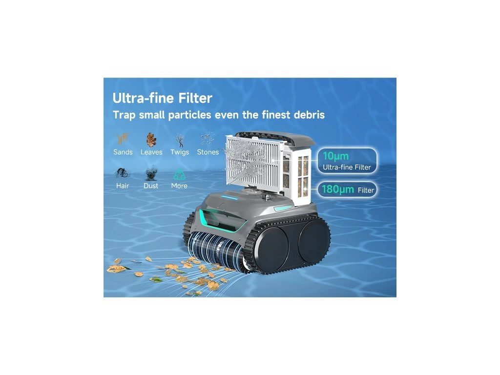 Velkou výhodou je dvoustupňová filtrace. Filtrační koš zachytí hrubší nečistoty a ultra jemný filtr s HEPA efektem odfiltruje i velmi drobné částice, které mohou způsobovat zákal. Výsledkem je viditelně čistší voda. Bezdrátový provoz zvyšuje komfort při používání a díky dlouhé výdrži zvládne vysavač vyčistit i větší bazény na jedno nabití.