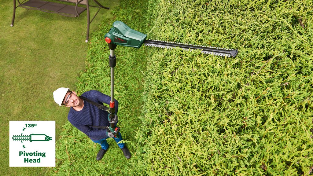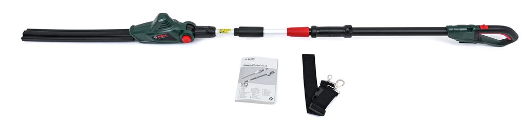 Akumulátorové teleskopické nůžky na živé ploty Bosch UniversalHedgePole 18 jsou součástí aku programu POWER FOR ALL. Představují ideální řešení pro pohodlné a efektivní stříhání vysokých živých plotů. Díky teleskopické tyči, která umožňuje nastavení výšky až do 2,6 metru a otočné hlavě, je možné dosáhnout i na nejtěžší místa bez použití žebříku nebo dodatečného nářadí.