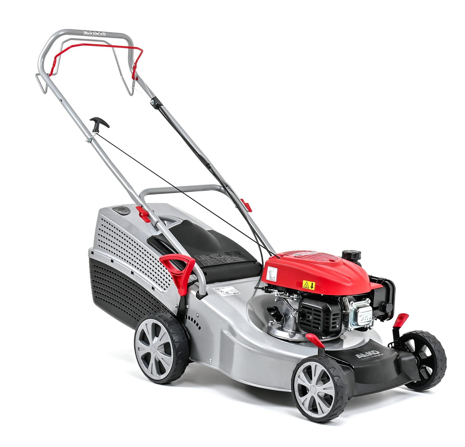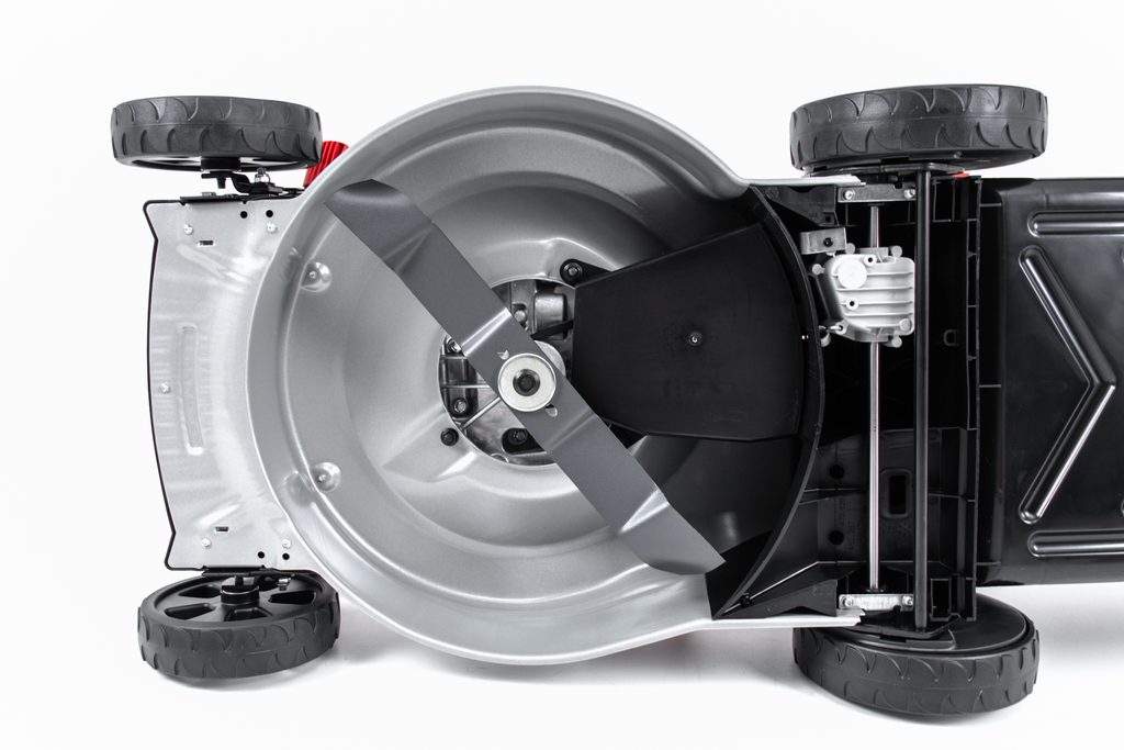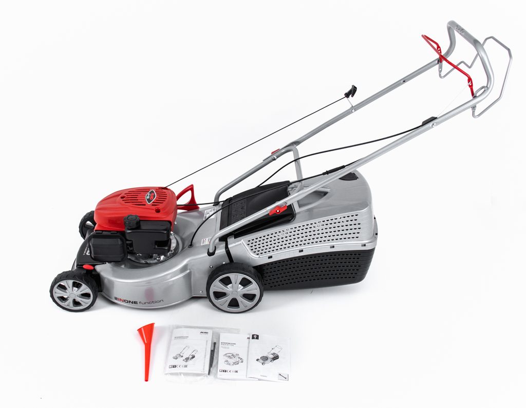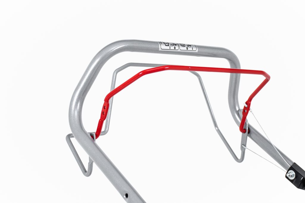 Výška sečení je nastavitelná v 7 stupních a nastavuje se u předních kol jednotlivě, u zadních kol centrálně. Má ergonomickou rukojeť, která se dá sklápět pro snadnější transport a skladování.