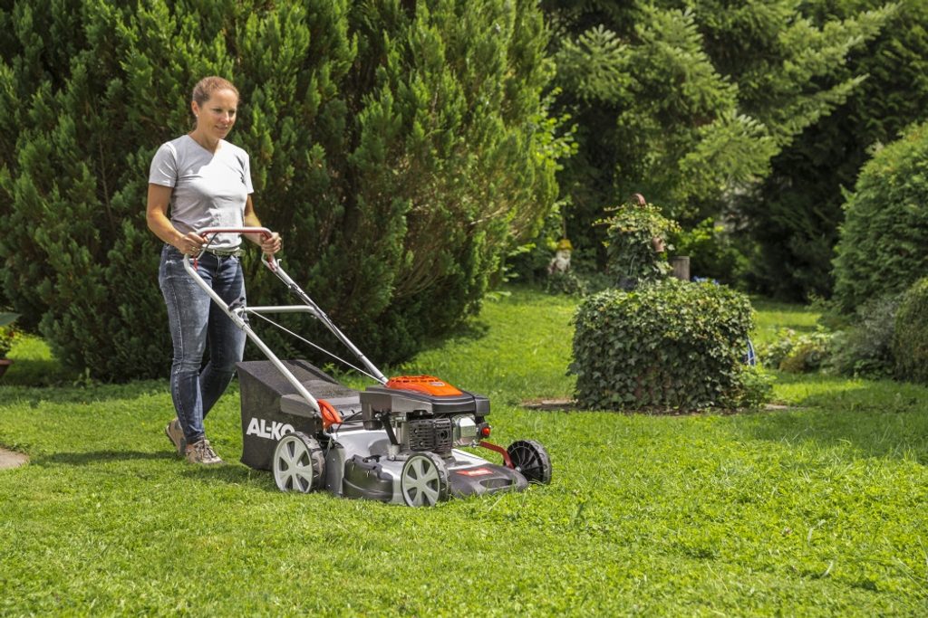 Komfort při práci se sekačkou je zajištěn jednorychlostním pohonem kol nebo ergonomicky tvarovaným držadlem. Funkce 4v1 umožňuje posečení trávy, sběr do koše, mulčování a boční výhoz.