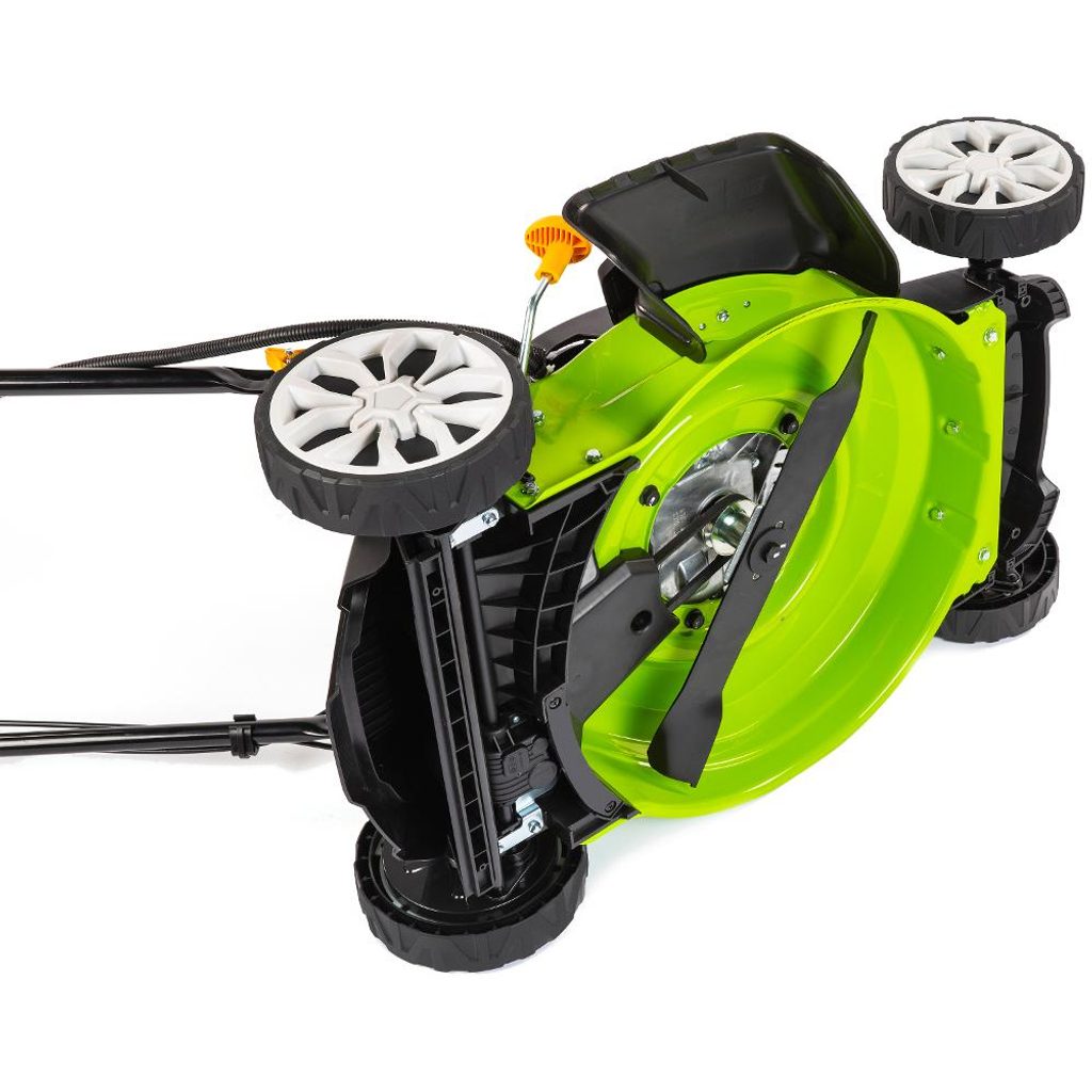 | Funkce | Centrální nastavení výšky , Mulčování , Boční výhoz , Elektrický start , Kuličková ložiska , Ukazatel plnosti koše |