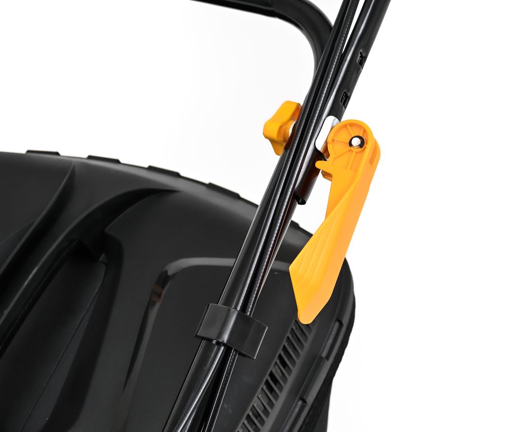 Centrální nastavení výšky sečení do 7 pozic. Nejnižší pozice pro velmi nízký střih trávníku. Objemný koš s plastovým topem, pohodlným madlem a odvodem vzduchu do stran (šetrné pro alergiky).