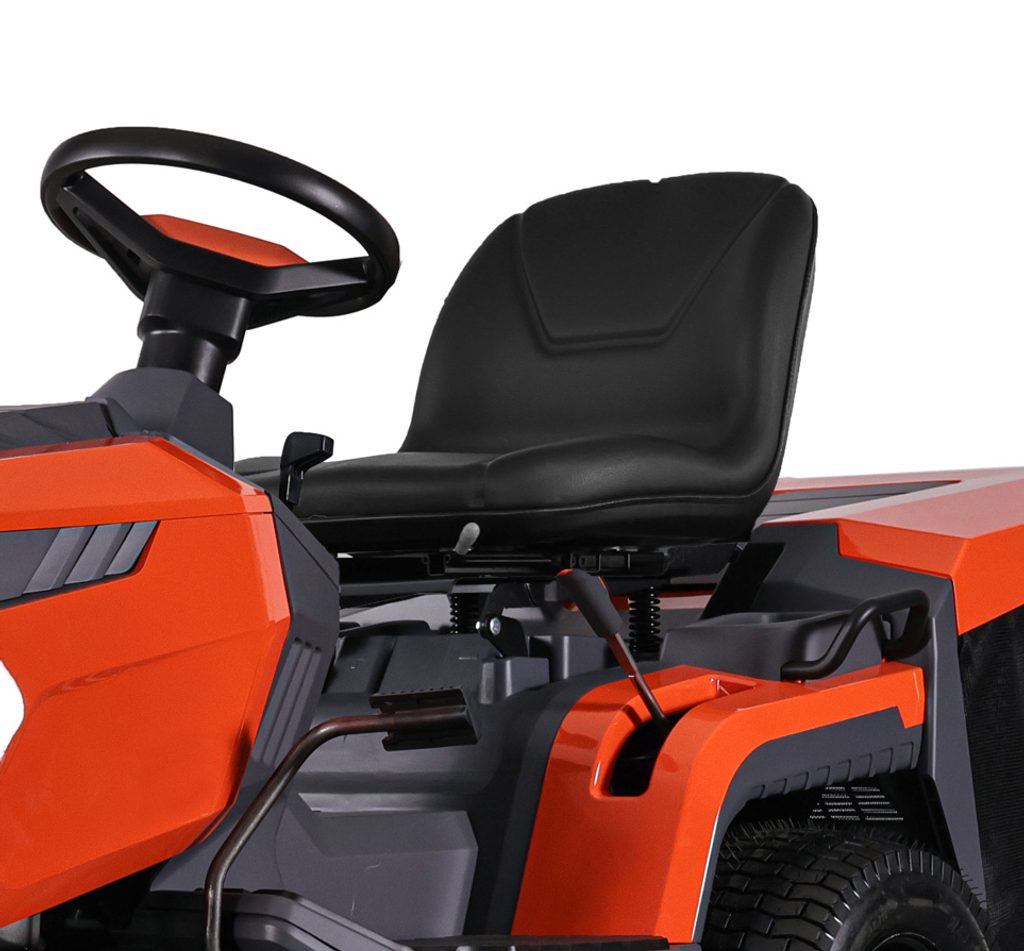 Hydrostatická převodovka zajišťuje plynulý pohyb a pohodlné ovládání, a to i v členitém terénu. Velký sběrný koš o objemu 280 litrů vám ušetří časté vysypávání trávy, zatímco robustní kola (15” vpředu a 18” vzadu) a dvojice anti-skalpovacích kol chrání váš trávník před poškozením.