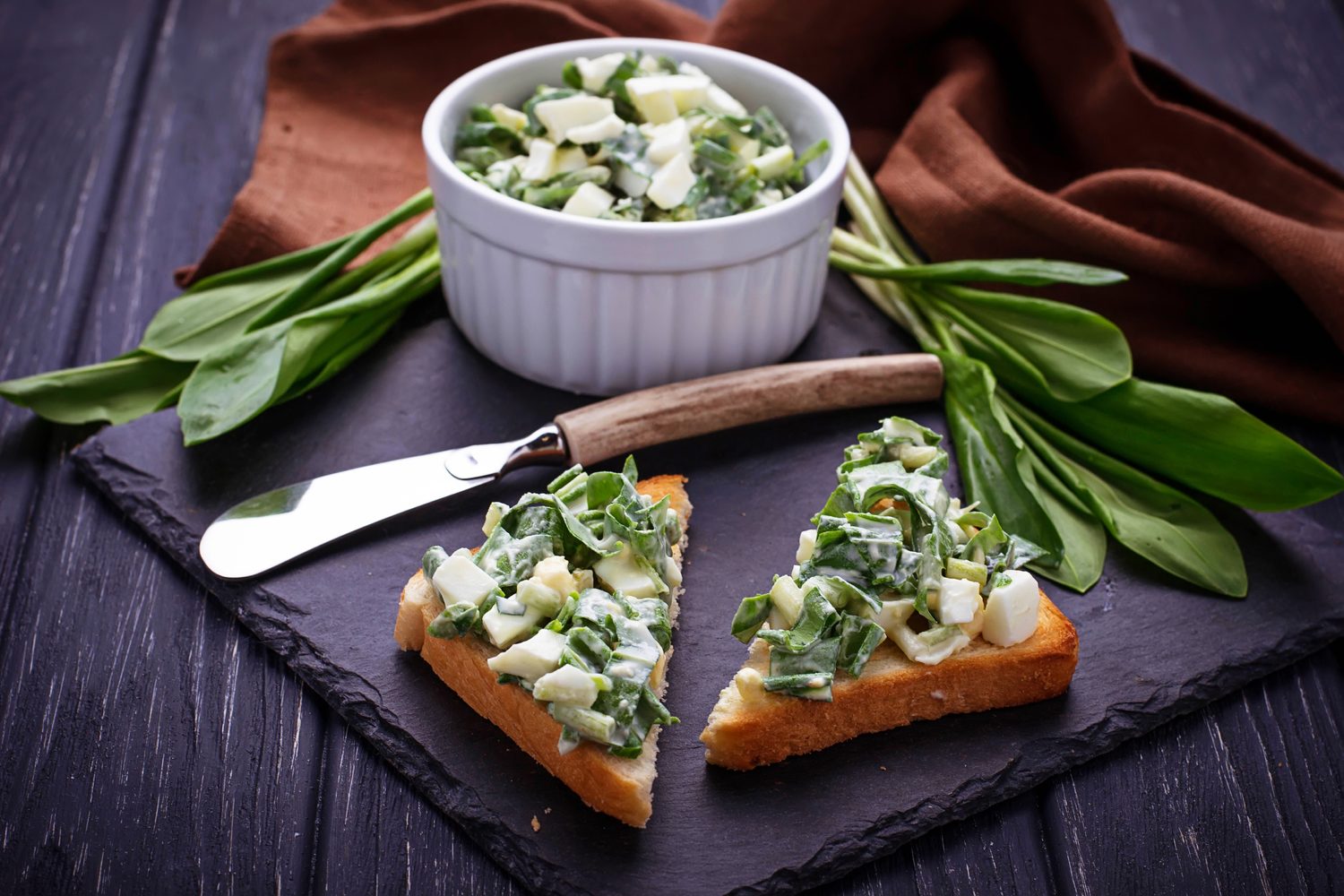 Uvařená vejce a medvědí česnek nakrájejte. Promíchejte se smetanou a dochuťte hořčicí, pepřem a solí. Hotový salát nechte chvíli odležet a podávejte s domácí bruschettou.