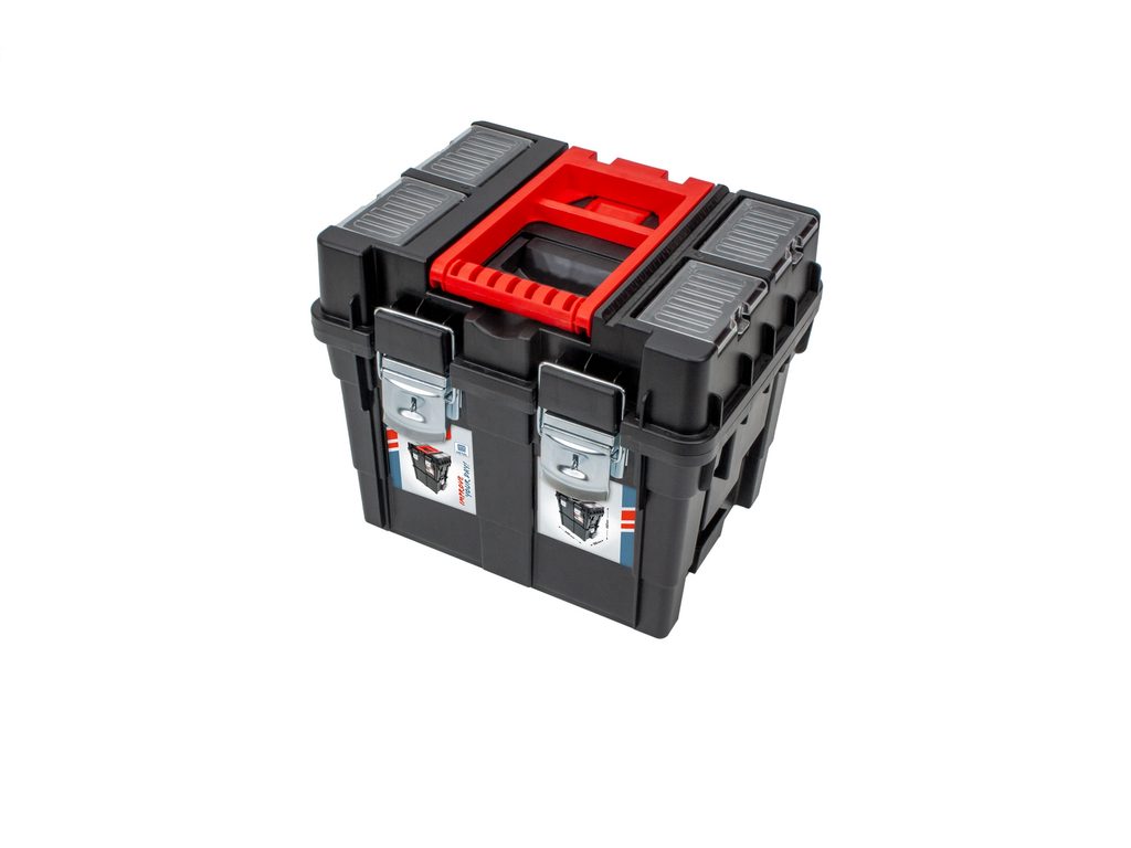 Tento box je vybaven pevnými kovovými přezkami, díky kterým zůstane vaše nářadí vždy bezpečně uloženo. Vrchní část tvoří velmi odolný čirý polykarbonátový organizér, ve kterém snadno najdete drobné součástky a příslušenství, vše máte vždy přehledně po ruce. Box je navíc dostatečně prostorný, abyste do něj uložili i větší nářadí.