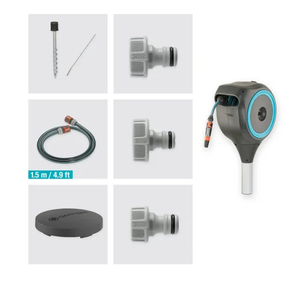Zahradní box na hadici je dodáván s pružnou připojovací hadicí, všemi potřebnými montážními díly, prvky Original GARDENA System a postřikovačem se dvěma různými vzory postřiku.