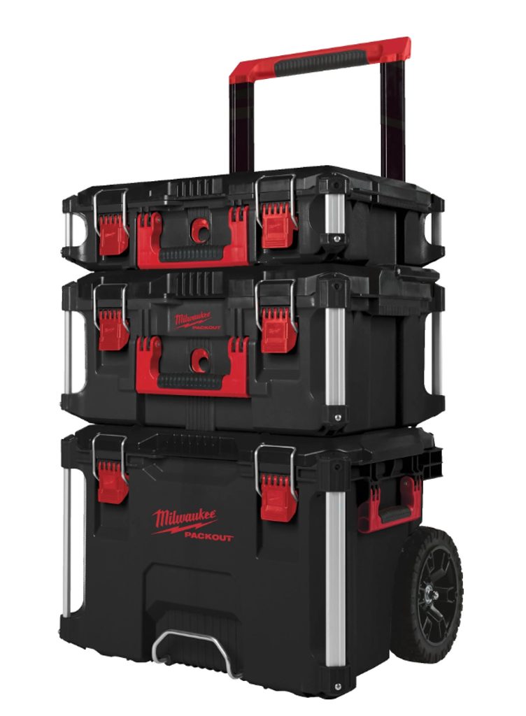 Boxy na nářadí Milwaukee PACKOUT 3PCS SET-1PC obsahují tři různé boxy: jeden PACKOUT™ pojízdný box, jeden PACKOUT™ velký box a jeden PACKOUT™ box. Tento set je součástí modulárního skladovacího systému PACKOUT™.