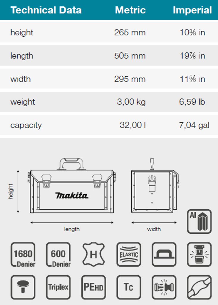 Brašna Makita E-15394 je vyrobená z vysoce odolného a pevného materiálu, který zajišťuje dlouhou životnost i při intenzivním používání. Integrovaný ramenní popruh umožňuje pohodlné přenášení, což oceníte zejména při delších přesunech mezi pracovišti.