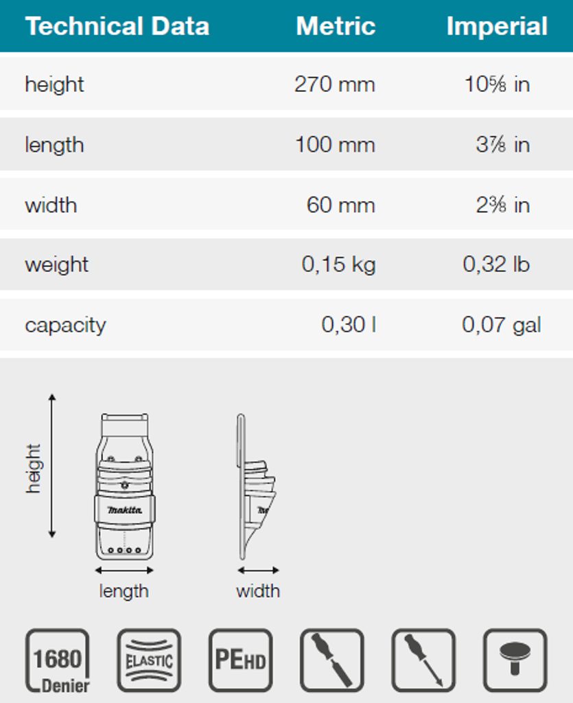 Brašna pro tesaře Makita je vyrobena z vysoce odolného polyesteru, což zaručuje její dlouhou životnost i v náročných podmínkách. Díky jednoduchému systému uchycení na opasek máte své ruční nářadí vždy po ruce, což výrazně usnadňuje a urychluje práci.