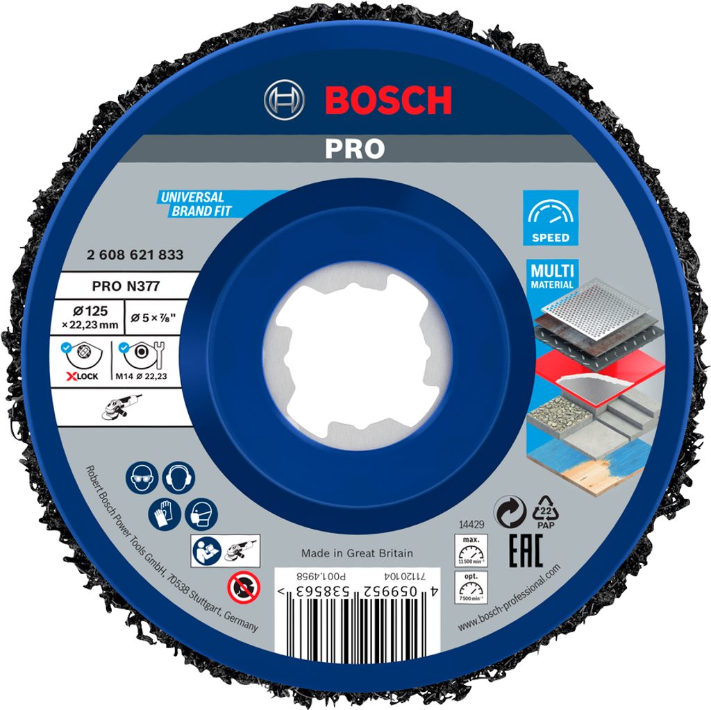 Čistící kotouč Bosch PRO N377 lze snadno nainstalovat pomocí systému X-LOCK, což umožňuje rychlou a bezpečnou výměnu bez potřeby dalších nástrojů. Alternativně, kotouč může být použit s úhlovými bruskami, které mají standardní matici a závit, což zajišťuje širokou kompatibilitu s většinou běžně používaných úhlových brusek.