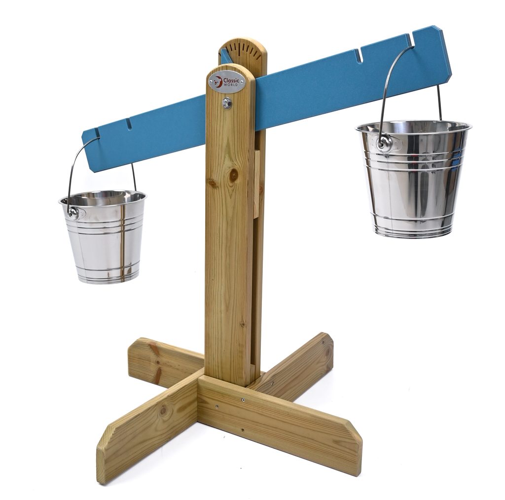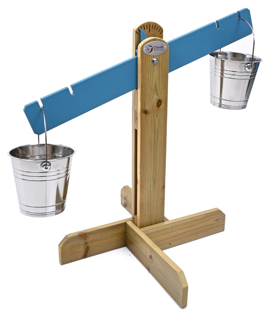 Tato dětská dřevěná váha Classic World od Jarabáka je balanční váha určená pro nekonečné vyvažování jak písku, tak vody. S touto váhou mohou děti naplňovat kovové kbelíky pískem, vodou nebo oblázky tak, aby byly v jedné přímce. Tato ideální sada je skvělým nástrojem pro rozvoj manuálních zručností, kreativity a logického myšlení.