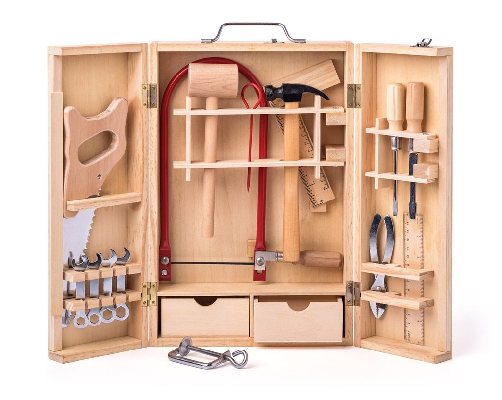 Kovové nářadí Woody je reálnou kopií skutečného nářadí pro dospělé. Praktický dřevěný kufřík s panty, v němž je nářadí umístěno, je opatřený kovovými přezkami a uchem pro snadné přenášení.