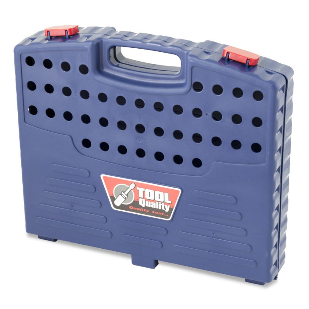 Kufřík plný nářadí se lehce rozloží. Ve stěně kufříku jsou umístěny otvory, na kterých jsou háčky na zavěšení nářadí. Nářadí se tak na stůl krásně vejde a vše je po ruce. Vychytávka je v tom, že přidáním nohou ke kufříku máte rázem pracovní ponk.